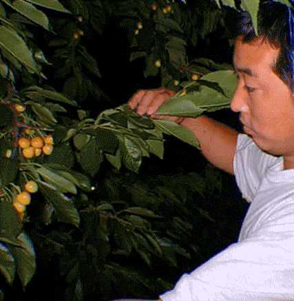 6月22日(土)義明さんの家へおじゃました。義明さん自慢のさくらんぼ(南陽)は、まだ青い。